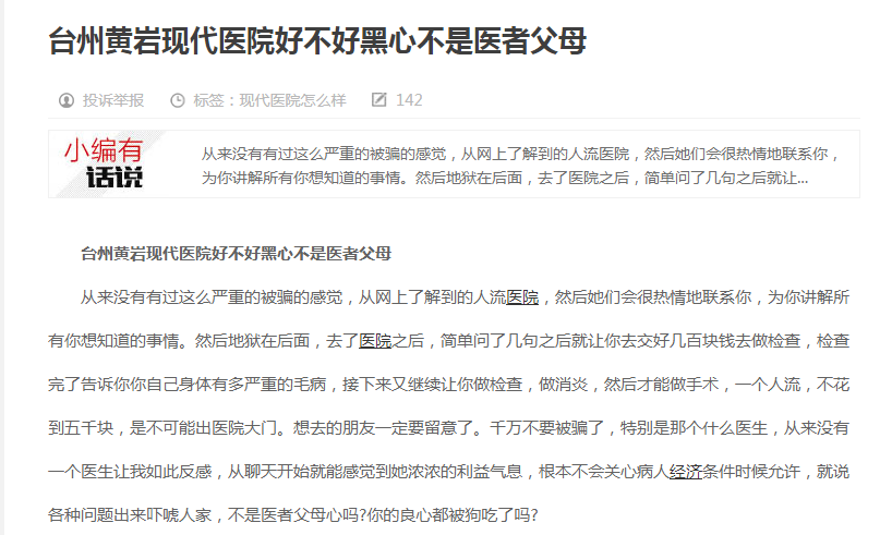 这种网站大多的文章都是来源于各个医院的负面信息,大同小异,就是把医院名称改了,其内容几乎一样。我院负责人通过网站提供的联系方式联系到写作人,提出600元删帖的要求!因为利益唆使,他们已经失去了做人的基本底线,而这正是这样,才导致台州现代医院被黑的程度造成的负面影响很大。